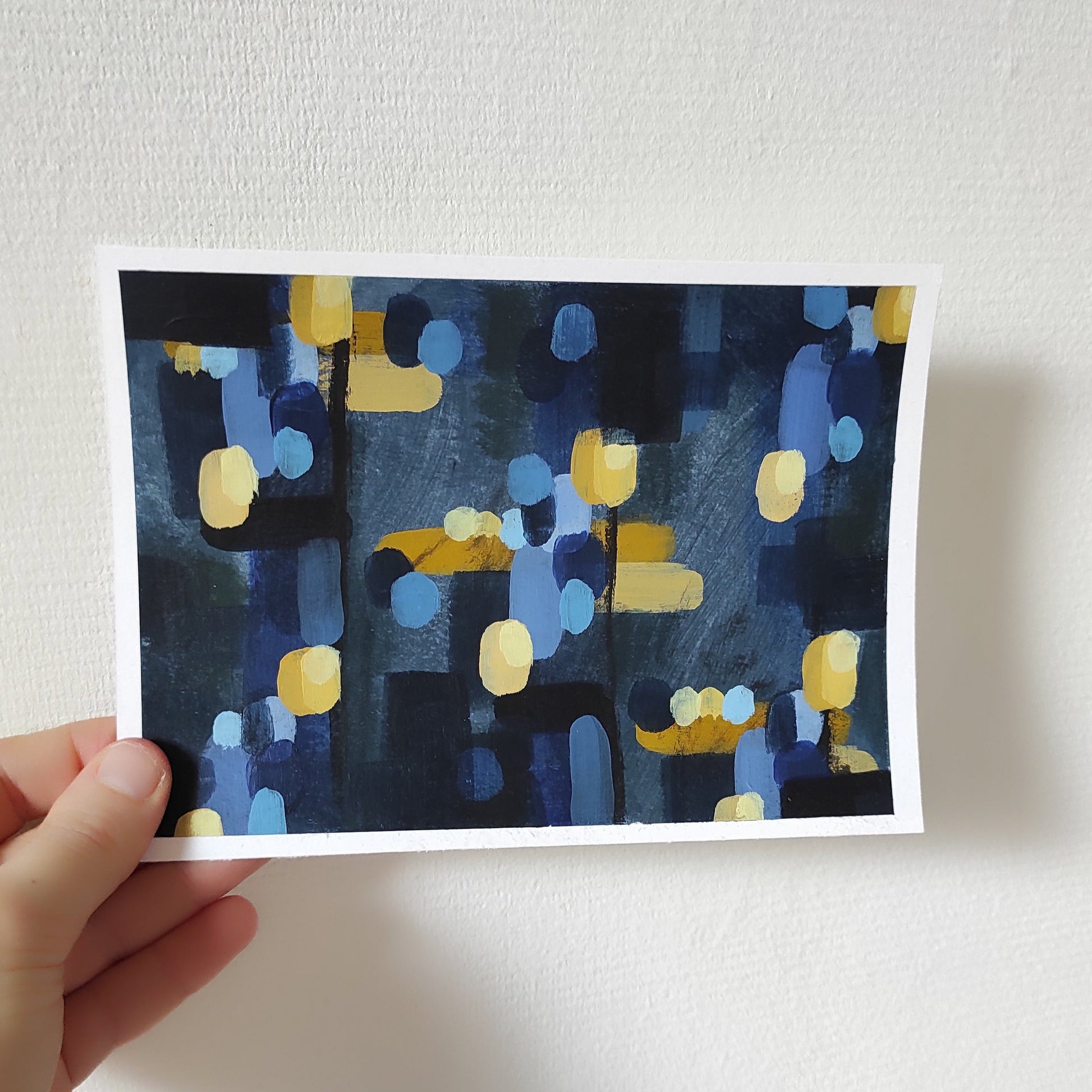 An intuitive abstract painting, with dark blues and soft yellow touches. It has a sibling, namely Looking for Lights #1. See the other items for it, these work amazing as a set.